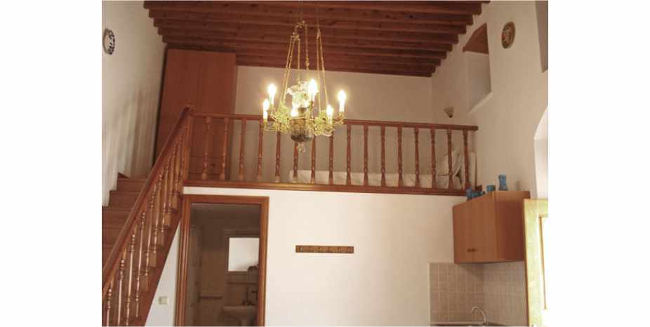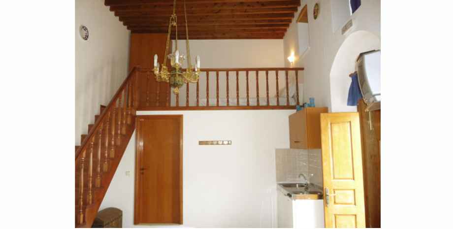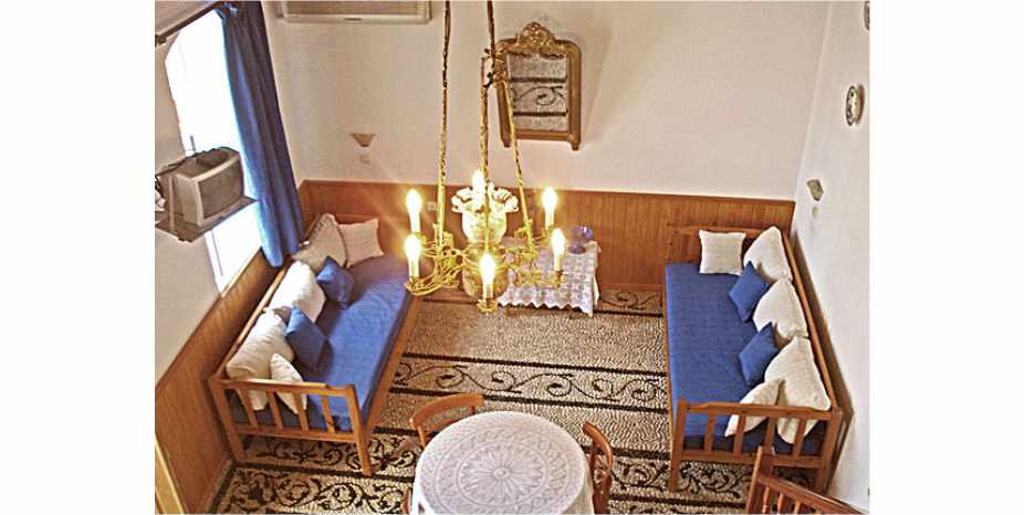 Room 3 is the sala of a traditional house of Lindos. Sala is the greek word for sitting room. A room where the family used to sit all together. The sala has now been renovated into a self catering studio. Still with the same historic charm of the original carved wooden ceiling and hohlaki stone floor. This studio can sleep 4 people, with two on the raised sleeping area and the other two on the ground floor area.